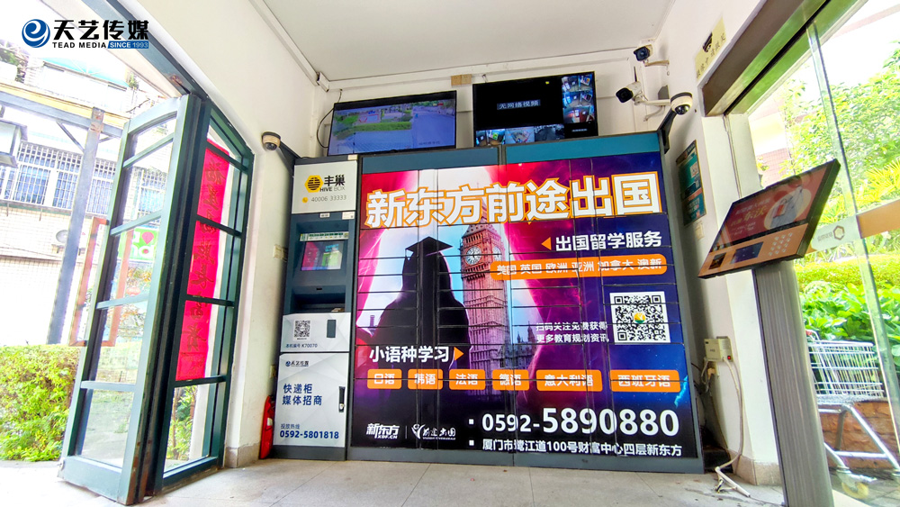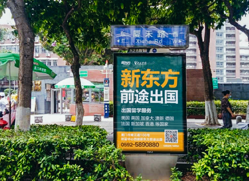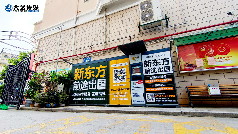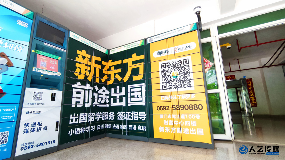 廈門(mén)新東方前途出國(guó)服務(wù)機(jī)構(gòu)位于鷺江道財(cái)務(wù)中心四樓,與廈門(mén)天藝傳媒合作,目前在主干道路名牌與生活小區(qū)的快遞柜媒體進(jìn)行部分宣傳合作。